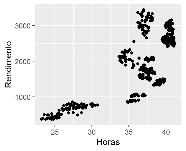 ## 2 Norte 1º trimestre 2016 14 a 17 anos 24.4 511 25.9Portanto, trabalharemos com a tabela chamada ``emprego’’. Um gráfico simples que relaciona horas trabalhadas e rendimento é: