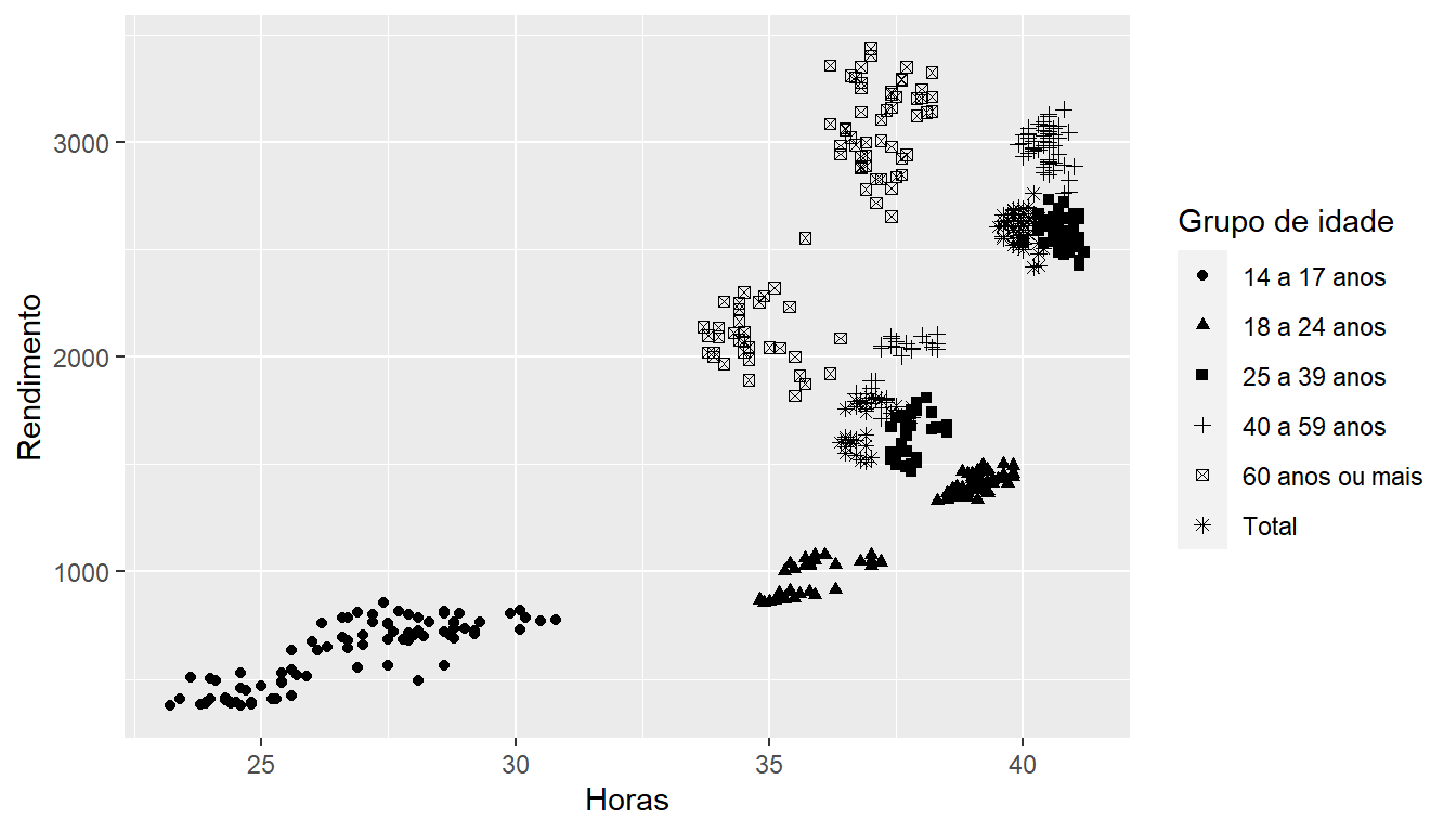 aes(x = Horas, y = Rendimento, shape = `Grupo de idade`)) +